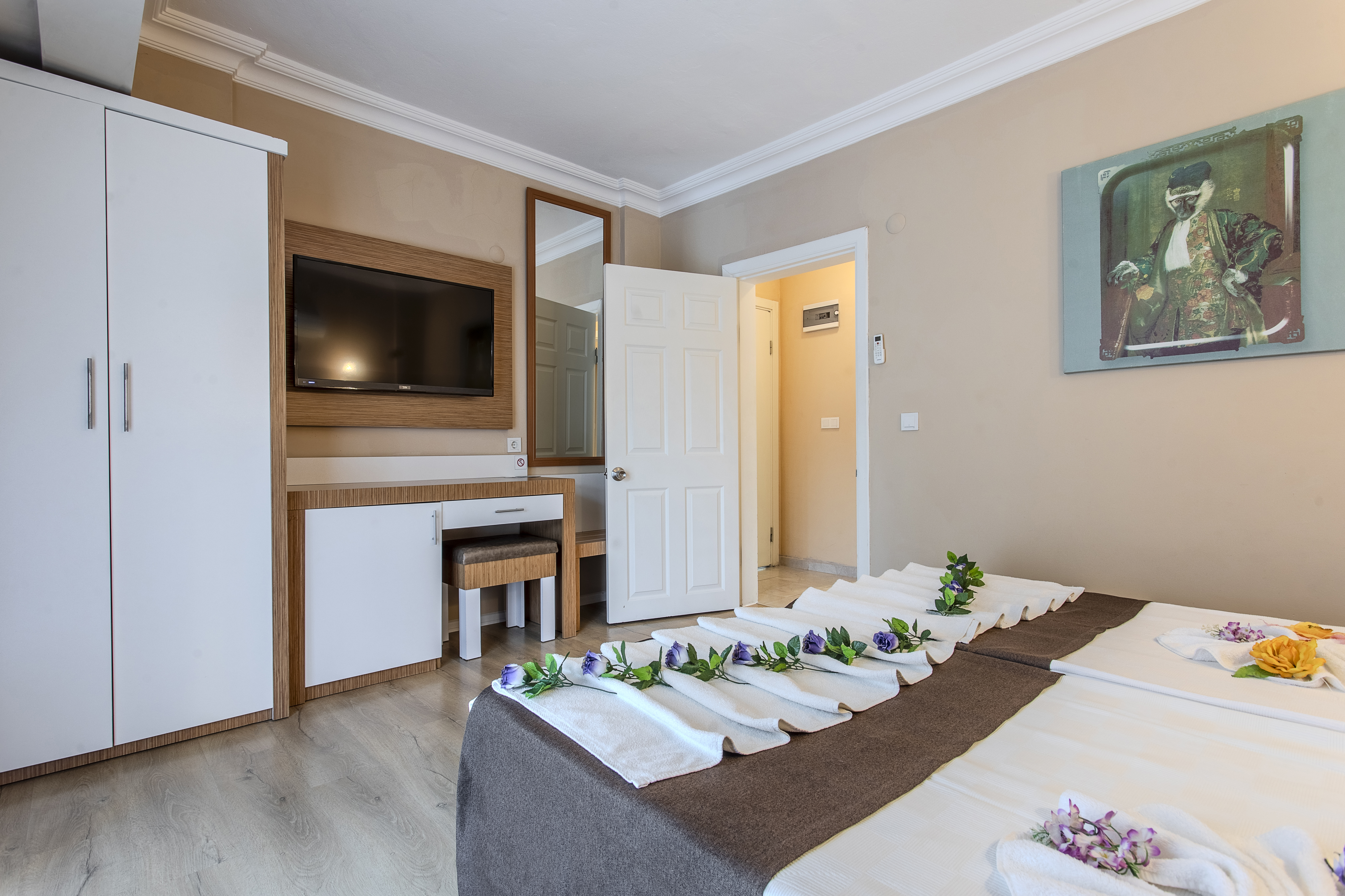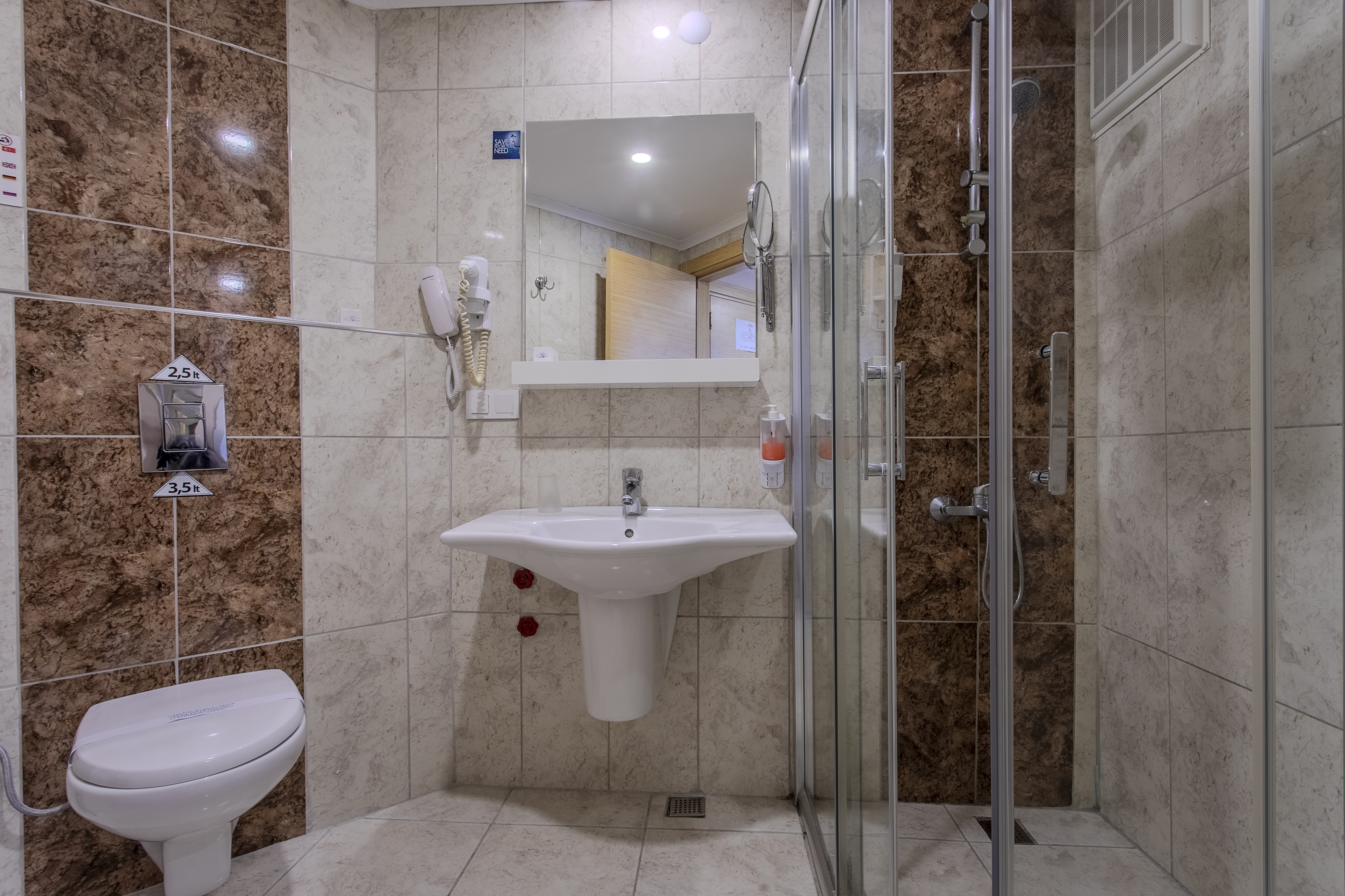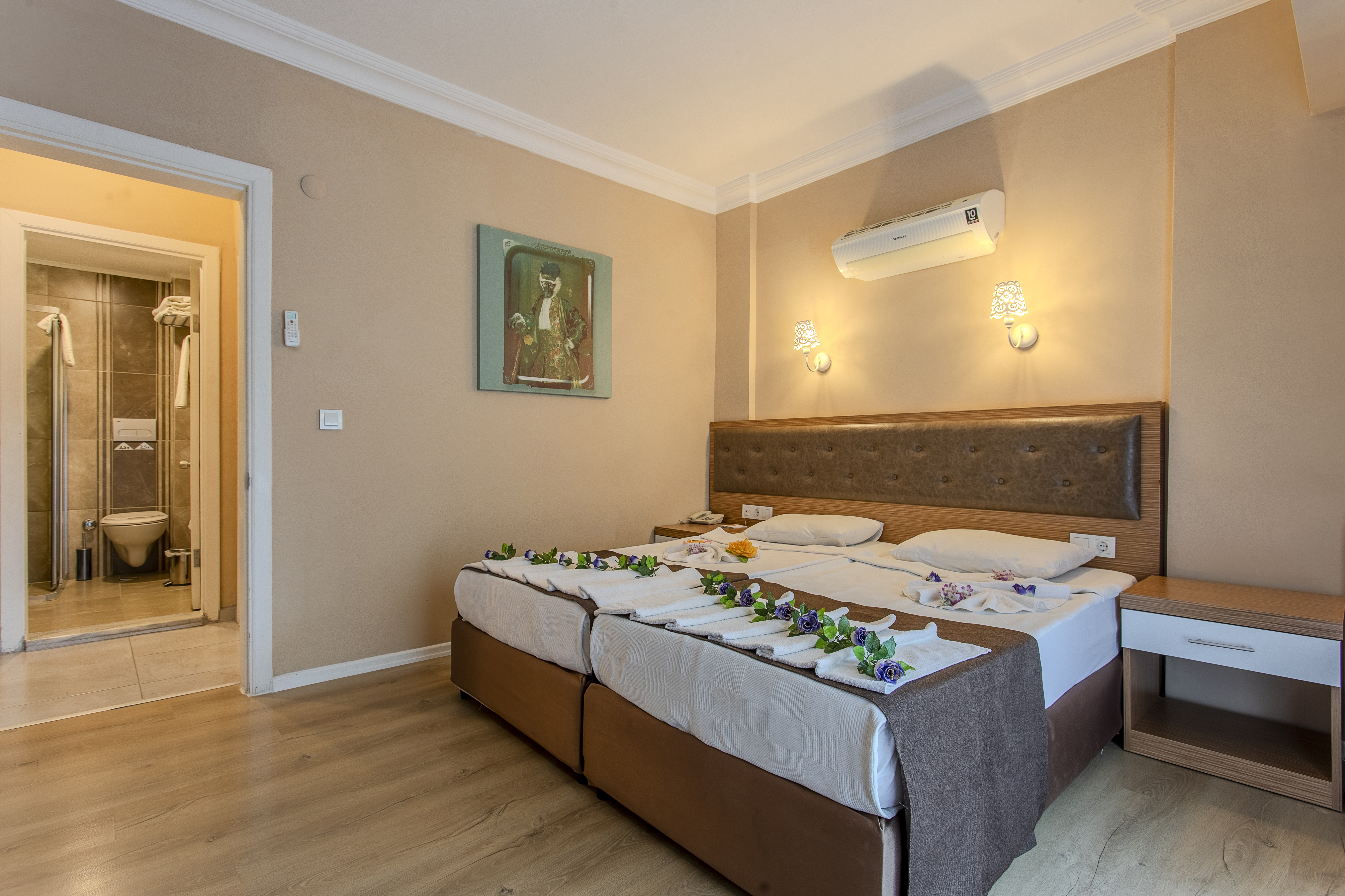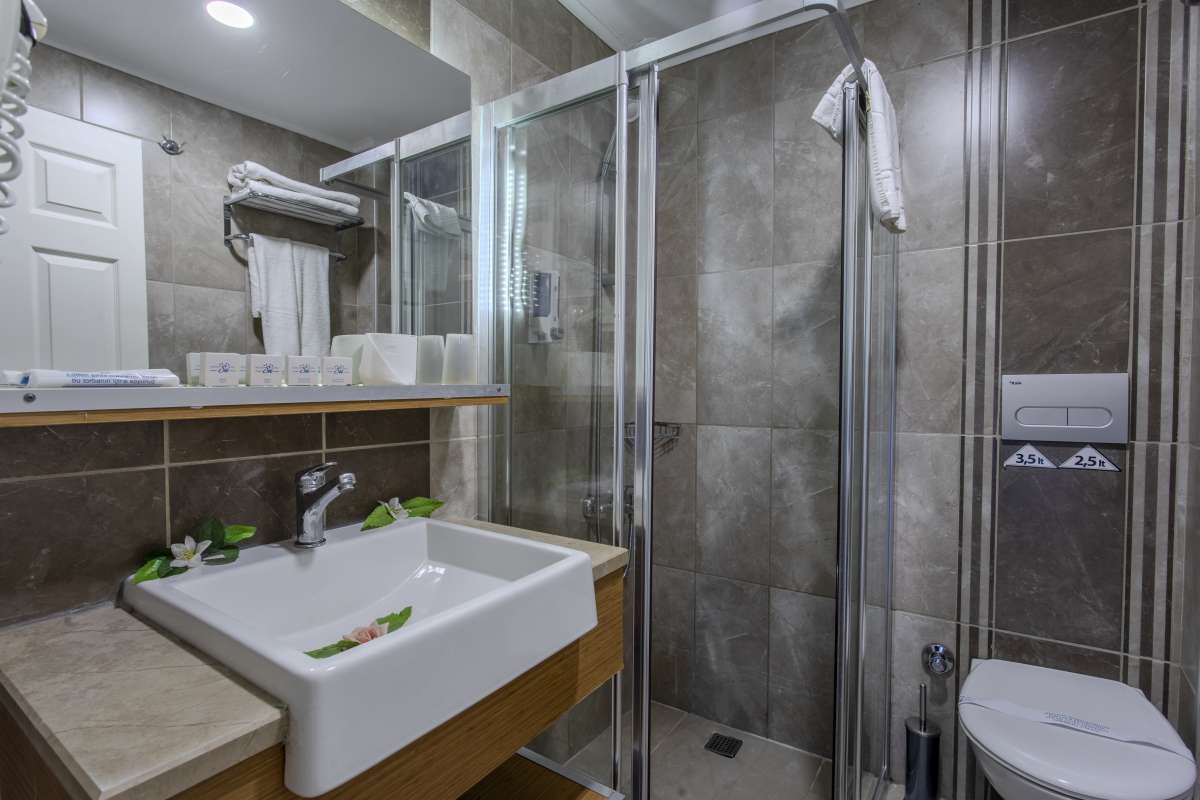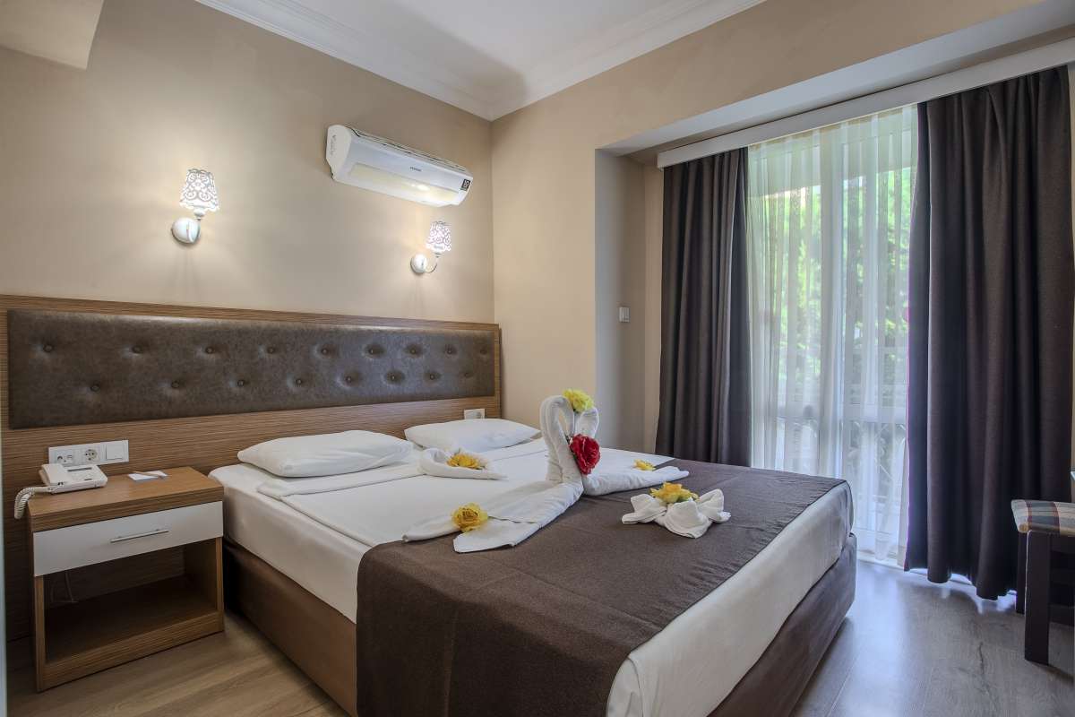 Ana ve yan binadaki odalar taş zemin küvet yada duş/WC saç kurutma makinası , telefon, uydu bağlantılı televizyon, mini bar, (geliş gününde su ile doldurulur.) kasa (ücretli) 2 adet klima (bağımsız ayarlanabilir)